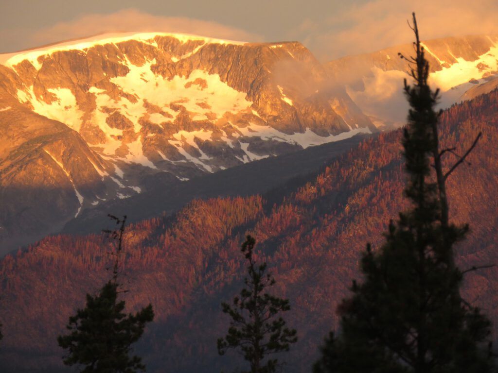 The light still caught the mountains near Tatla Lake and a shower of rain produced a dramatic rainbow. (The hills it is sitting on are the burned ridges of last year’s Kleena Kleene fire, hence the weird colour.)