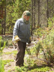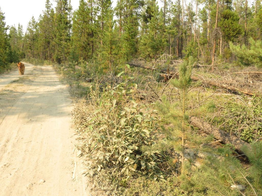 So I fetched him again and had all five of them work on my “fireguards.” Old roads pretty much surround my 40 acres, and the idea is to clear low branches and dead wood for an area on either side of the roads in the hope that a fire coming this way will be stopped. It won’t halt a crowning fire, but it would be very effective give against a creeping one.