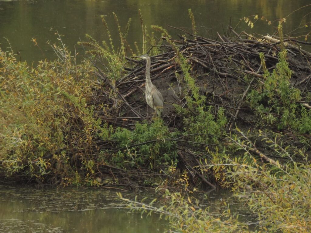 Herons are not seen very often here. This one sat on the beaver house. The house has not been used for a couple of years, but the beavers are still maintaining the dam.