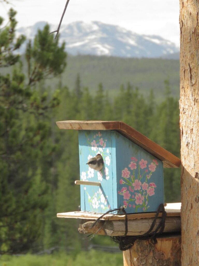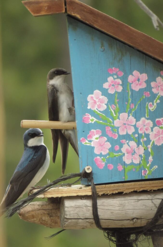 At a craft fair I saw a hand-painted bird house and bought it for decoration purposes. I’ve had a box for years close to the pond but the only thing that has moved in is a squirrel. I was delighted when a family of tree swallows took over this one.