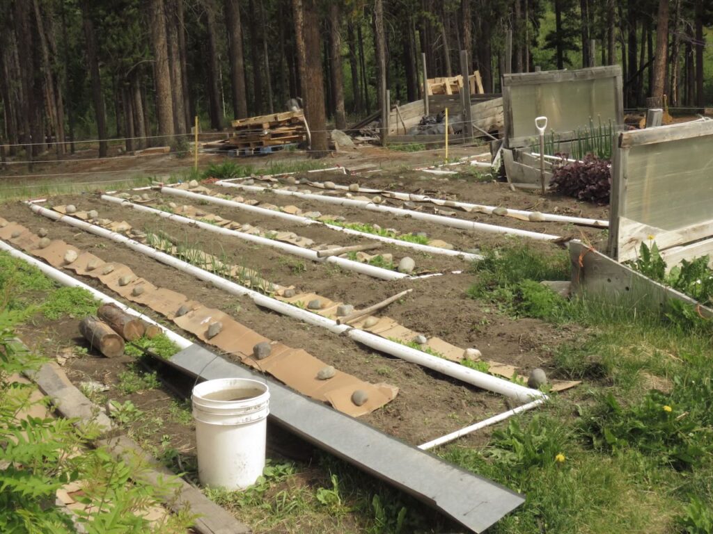 I tried a couple of new wrinkles this year. I irrigate from the beaver pond below the house. Instead of having the water spray in all directions (I didn’t drill the pipes accurately enough) I put half sewage pipes over the sprays and concentrated the water near the seeds. On the other side of the rows I laid cardboard. It would help retain the water and also suppress weeds. Both innovations worked very well.