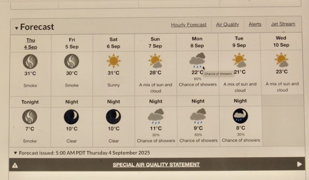 But I wasn’t going to budge. The nearest fire was 12 km away, which would have been of concern if the wind had been bad, but only moderate winds were forecast. Soon the weather forecast included smoke warnings. The temperature was quite hot at this point, around 30C.