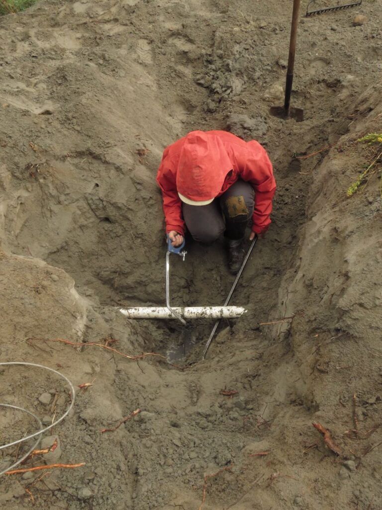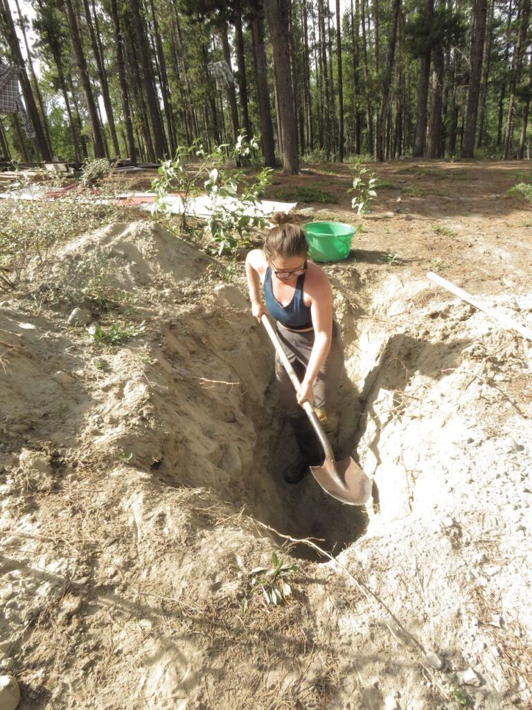 Alyssa, who has volunteered here several times, offered to come. She is a tree planter and an expert digger. My greywater drain blocked over the winter. Trouble is, I wasn’t exactly sure where it ran. I knew it was under the garden. Fortunately the ground is fine silt and almost rock-free. Alyssa dug a couple of humungous exploratory holes.