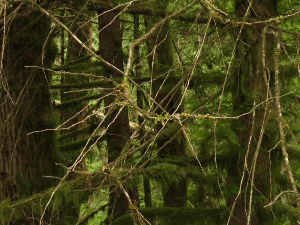 I tried to pick the best days for doing interesting things.  One cooler day with a wind change that made things a little clearer, we went down to Bella Coola.  The forestry students in particular were enraptured by the big trees.Things really liked this thimbleberry leaf.Foam flower:It was about then that my camera battery died – and I found out I had not charged the spare.  So I took no photos of the rest of the trip – the visit to the petroglyphs and the ocean – and our couple of hours’ work picking blueberries from a U-Pick farm.  Last year I collected 40lbs and decided that wasn’t enough. So I planned for 50lbs – then thought as I had 4 extra hungry people to feed, I’d get 60lbs.  We ended up with 97 lbs!!  My freezer was bulging. We had to abandon a trip to Perkin’s Peak – too smoky and risky – but in fact a wind shift gave us one clear afternoon, and we could see the fire clouds boiling up from down the Klinaklini River.The slab of smoke was to the west of us and the sun set gorily into it.Next day the wind shifted a point of two to its more normal path and we were soon enveloped again.It’s the unrelenting dreariness of it all that gets to me.One evening I treated us all to a dinner at the Terra Nostra Guest Ranch across the river. It was a treat for me as well – I didn’t have to cook – or do dishes!  It was not cheap – but it was a fantastic meal.  I had no idea they accepted off-road guests and it is something I will do again.  We and the dozens of German tourists sat outside at a long table and admired the smoke.Our street lamp.It was obvious that the smoke was quite local as the mountains around Tatla were quite sunny despite the veil of smoke between us.